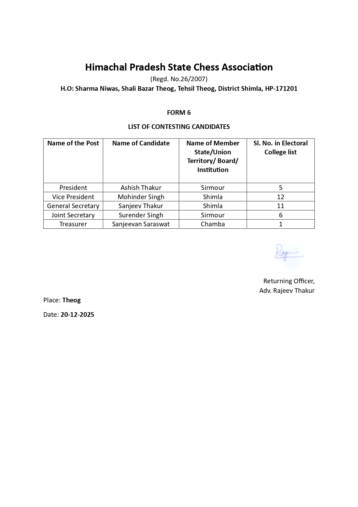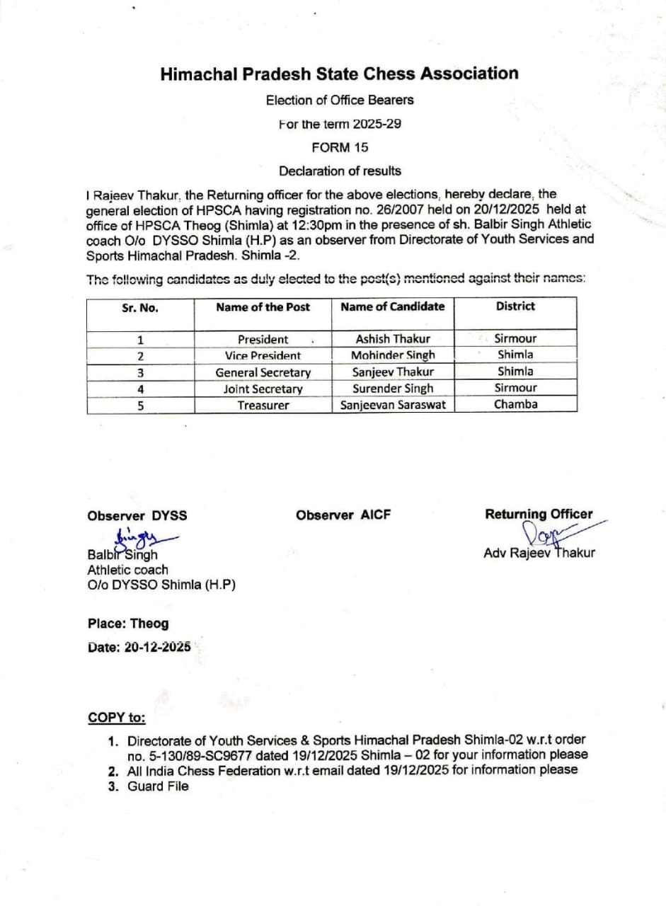 Himachal Pradesh State Chess Association(HPSCA) came into existence on dated 24th July 2007 when it was registered with Regn. No. 26/2007 by its founder members. The President, General Secretary and Cashier at that time were Sh. Sandeep Sharma, Sh. Ashok Bhardwaj and Late Sh. P.S. Khachi. The Registered Head office of the association is situated at Sharma Building, Shalli Bazar Theog, District Shimla. …More